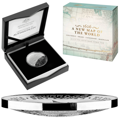 Es handelt sich bei dieser wunderschönen Münze um eine 2. Ausgabe der gewölbten Prägungen in 1 Oz Feinsilber der Royal Australien Mint und zeigt eine Weltkarte von 1626. Die Serie ist bereits in 1 oz Gold erschienen und dies ist nun die Silberausgabe zu dieser Serie. Die Münze besteht aus 1 Oz Feinsilber in der Reinheit 999 und wurde in der höchsten Prägequalität Polierte Platte geprägt. Die Ausgabe ist auf die geringe Stückzahl von nur 5.000 Stück weltweit streng limitiert. Die Auslieferung erfolgt im Original-Etui mit Umverpackung und nummeriertem Echtheitszertifikat.