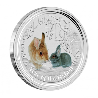 Neben den normalen Silbermünzen in Stempelglanz hat die Perth Mint Australia ebenfalls Silbermünzen in Stempelglanz aber coloriert in unterschiedlichen Größen verausgabt. Es handelt sich hier um die 1/2 Oz Ausgabe zum Jahr des Hasen. |