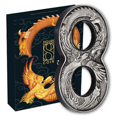 Die 8 symbolisiert im Asiatischen Raum Glück, die The PerthMint Australia verausgabte 2018 und 2019 bereits eine Münze in der Form einer 8. Die Ausgabe von 2020 zeigt nun das Motiv Drachen und Phönix. Die Ausgabe ist für das perfektische Erscheinungsbild zudem in Antik Finish veredelt und auf nur 3.888 Stück weltweit streng limitiert. Die Münze besteht aus 2 Oz Feinsilber und wird im Original-Präsentationsaufsteller mit Umverpackung und nummeriertem Echtheitszertifikat verausgabt. |