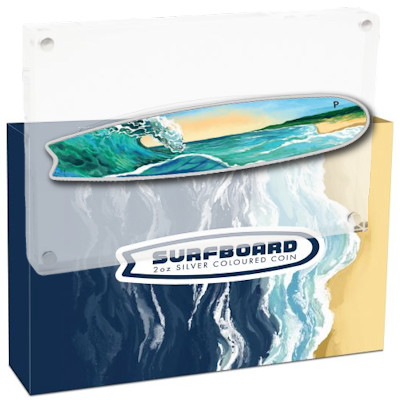 Sand- und Brandungsdesign Die Motivseite der Surfbrett-förmigen Münze zeigt ein farbiges Bild einer Welle, die nahe einer australischen Küste bricht und sich vor einem malerischen Sonnenuntergang abhebt. Präsentationsverpackung und nummeriertes Zertifikat Begleitet von einem nummerierten Echtheitszertifikat wird jede Münze in einer klassischen schwarzen Vitrine präsentiert und in einem themenbezogenen Versender verpackt. Die in Form eines Surfbretts (erstmalig!) geprägte 2 Oz schwere Feinsilbermünze ist aufwendig coloriert und auf nur 2.500 Stück weltweit streng limitiert! |