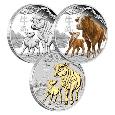 | Australien - 3 AUD Lunar III Ochse Set 2021 - 3*1 Oz Silber TRIO | ||