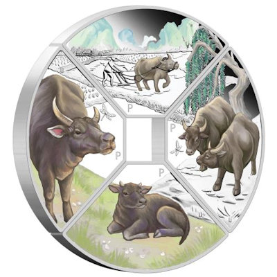 Es handelt sich hier um das 4er Quadrant Set zum Jahr des Ochsen, ausgegeben von Tuvalu und produziert von der The Perth Mint Australia. Die aufwendig colorierten Formmünzen kommen in der höchsten Prägequalität Polierte Platte, sind aufwendig coloriert und auf nur 1.500 Stück weltweit limitiert. Die sich ergebene Form erinnert an frühere chinesische Zahlungsmittel. |