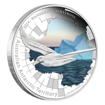 Die 2014er Ausgabe aus der beliebten Serie Antarctic Territory widmet sich dem ziehenden Albatross (Wandering Albatross). Es ist bereits die 11. Ausgabe dieser jährlich erscheinenden Serie. Die Flügel des Albatross sind die Größten aller lebenden Vögel und kann bis zu 3,5 Meter in der Spannweite betragen. Die Münze kommt im typischen Seriendesign und ist aufwendig coloriert. Die Ausgabe ist auf lediglich 7.500 Stück weltweit limitiert. |
