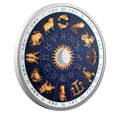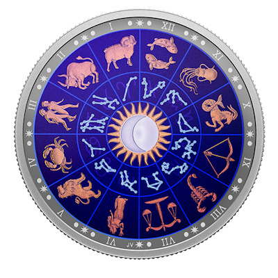 Was ist ihr Sternzeichen? Die 12 Tierkreiszeichen (und ihre entsprechenden Glyphen) besetzen jeweils einen 30-Grad-Ausschnitt des Nachthimmels auf dieser 2 Oz schweren Feinsilbermünze. Auf der Rückseite Ihrer Münze verleiht die Metallic-Farbe den tiefen Farbtönen und gravierten Illustrationen, die das Mysterium und den Reiz des Tierkreises einfangen, einen faszinierenden Schimmer. Die 12 Tierkreissymbole sind alle von den Konstellationen abgeleitet, den Sternen, die einen Gürtel über den Himmel und diese Münze bilden, wo die himmlischen Muster verborgen bleiben, bis sie unter einem Schwarzlicht (im Lieferumfang enthalten) betrachtet werden.