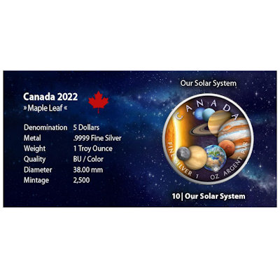 Diese neue colorierte Maple Leaf Serie ist unserem Sonnensystem gewidmet. In mehreren Ausgaben, beginnend mit der Sonne, werden aufwendig coloriert die Planeten unseres Sonnensystems farbenprächtig in Szene gesetzt. Die Münzen bestehen aus 1 Oz 9999er Feinsilber und werden gekapselt mit Produktkarte ausgeliefert. Die Auflage pro Ausgabe beträgt lediglich 2.500 Stück weltweit. Die Münze wurde von der Royal Canadian Mint aus Kanada geprägt und von einer privaten Firma aufwendig coloriert. Die Prägequalität der Münze ist Stempelglanz.