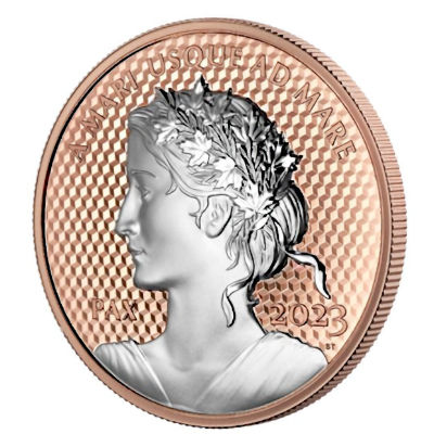 Das Motiv zeigt das Profil von Lady Peace, gekrönt von Ahornblättern. Ihr Gesicht wird von PAX 2023 und Kanadas nationalem Motto A MARI USQUE AD MARE (Von Meer zu Meer) begleitet. Die Vorderseite zeigt das Bildnis Ihrer Majestät Königin Elizabeth II. Die Münze besteht aus 5 Oz Feinsilber in der Prägequalität Polierte Platte, Ultra High Relief mit Sondereffekt des Hintergrunds und ist auf nur 1.250 Stück weltweit streng limitiert. Die Auslieferung erfolgt im Original-Etui mit Umverpackung und nummeriertem Echtheitszertifikat.
