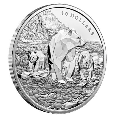 Diese wunderschöne Feinsilbermünze der Royal Canadian Mint ist die zweite Ausgabe der Serie Multifacetten Tiere und zeigt den Grizzly Bär mit zwei Jungtieren.