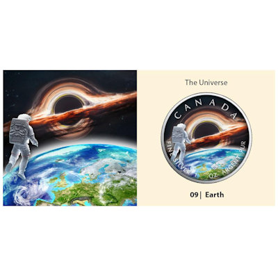 Nach dem großen Erfolg der Maple Leaf Serie Sonnensystem erscheint nun 2023 die neue Serie Maple Leaf Universum. Wie in der Sonnensystem Serie handelt es sich um colorierte 1 Oz Maple Leaf Silbermünzen die gekapselt mit Produktkarte ausgeliefert werden. Thematisiert werden dieses Mal nicht die Planeten sondern Objekte des Universums wie Meteoriten, Schwarze Löcher, usw. Die Auflage beträgt jeweils nur 2.500 Stück pro Ausgabe.