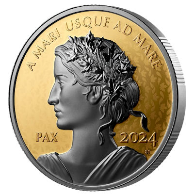 Das Motiv zeigt das Profil von Lady Peace, gekrönt von Ahornblättern. Ihr Gesicht wird von PAX 2024 und Kanadas nationalem Motto A MARI USQUE AD MARE (Von Meer zu Meer) begleitet. Die Münze besteht aus ca. 1 Oz Feingold in der Prägequalität Polierte Platte, Ultra High Relief und teilweise platiniert. Die Auflage ist auf nur 650 Stück weltweit streng limitiert. Die Auslieferung erfolgt im Original-Etui mit Echtheitszertifikat.