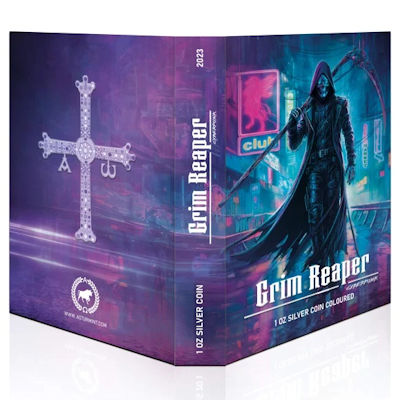 Diese aufwendig veredelte 1 Oz Maple Leaf Feinsilbermünze zeigt das Motiv des Grim Reapers Cyberpunk.