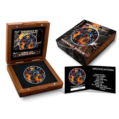 <<< Kanada - 5 CAD Maple Leaf Burning Rider 2023 - 1 Oz Silber Color | |