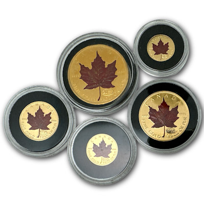 Anlässlich 20 Jahre Goldanlage Maple Leaf Feingoldmünze wurde von der Royal Canadian Mint dieses wunderschöne 5 teilige Jubiläumsset verausgabt. Die 5 Feingoldmünzen in den Größen 1 Oz, 1/2 Oz, 1/4 Oz, 1/10 Oz und 1/20 Oz 999er Feingold sind in der Prägequalität Stempelglanz geprägt, unzirkuliert, tragen das 20 Jahre Privy Mark und das Ahornblatt wurde aufwendig coloriert. Das Set ist auf nur 500 Stück weltweit streng limitiert. Die Auslieferung erfolgt im edlen Holzetui mit Umverpackung und Echtheitszertifikat. Ein seltenes Set das in jeder umfangreichen Maple Leaf Sammlung nicht fehlen sollte!