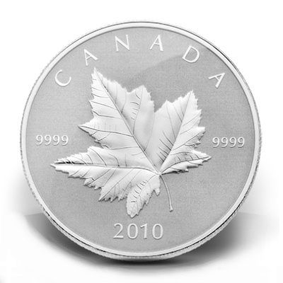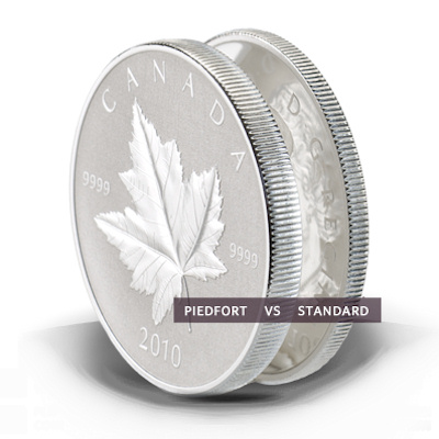 Eine der beliebtesten Silber Anlagemünzen verausgabt die Royal Canadian Mint 2010 als besondere Piedfort Prägung sowie einem Reverse Proof Finish (Höchste Prägequalität Polierte Platte) in einer streng limitierten Auflage von nur 9.000 Stück.