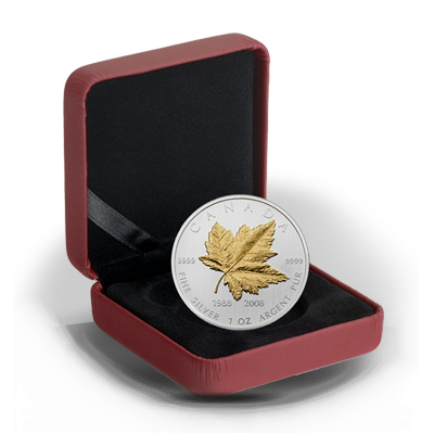 Anlässlich 20 Jahre Maple Leaf Anlagemünze verausgabt die Royal Canadian Mint eine Sonderedition des Silber Maple Leafs in höchster Reinheit 9999/10000 Feinsilber und aufwendig vergoldet. Die Ausgabe ist auf weltweit nur 10.000 streng limitiert.