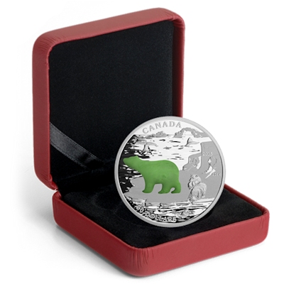 Es handelt sich hier erst um die zweite Münze die die Royal Canadian Mint mit eingebetteter Jade verausgabt. Die Münze zeigt ein Naturpanorama mit dem als Münzmotiv beliebten Eisbären, der komplett aus Jade besteht. Die Feinsilbermünze selbst ist in der höchsten Prägequalität Polierte Platte geprägt und auf nur 8.500 Stück weltweit limitiert. Die Ausgabe wird im Original-Etui mit Echtheitszertifikat verausgabt.