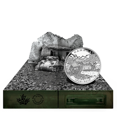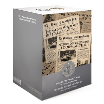 Diese Ausgabe wurde zum 70. Jubiläum des Endes des Italien-Feldzuges verausgabt. Das besondere an dieser Ausgabe ist das Etui, dass zugleich ein Panorama aus dem Feldzug nachempfunden ist. Die Münze kommt in höchster Prägequalität Polierte Platte, ist 1 Oz Feinsilber schwer und auf nur 10.000 Stück weltweit limitiert. Die Ausgabe umfaßt selbstverständlich ein nummeriertes Echtheitszertifikat. Auf der Motiv-Seite ist ein Sherman Panzer abgebildet.