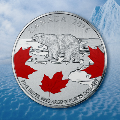 Als 3. Ausgabe der $25 for $25 Serie verausgabt die Royal Canadian Mint diese wunderschön colorierte Silbermünze mit einem hohen Nennwert von $25 zum Thema Wahrer Norden (True North) und zeigt einen Eisbären auf Eisschollen als Motiv. Die Münzen sind nah am Nennwert zu haben und somit eine gute Silberanlage ohne Verlustrisiko, da der Wert niemals unter den aufgedruckten Nennwert fallen kann.