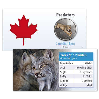 Der Luchs ist die 2. Ausgabe der neuen Predator-Serie der Royal Canadian Mint. Die Münzen kommen in der für die Royal Canadian Mint üblichen hohen Reinheit von 9999er Feinsilber und sind einzeln gekapselt. Es handelt sich hier um die colorierte Version mit einer Limitierung auf nur 5.000 Stück weltweit.