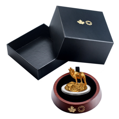 Diese besondere Prägung der Royal Canadian Mint zeigt eine Skulptur Münze mit dem Motiv des Wolfs. Es handelt sich um die fünfte und letzte Ausgabe dieser beeindruckenden Skulpturen. Die Silbermünze wiegt rund 315g, also 10 Oz Feinsilber in der hohen Reinheit 99,99%. Die Münze ist in der höchsten Prägequalität Polierte Platte gefertigt, die Skulptur des Wolfs ist zudem aufwendig und hochkarätig vergoldet. Die Ausgabe ist auf nur 1.200 Stück weltweit streng limitiert. Die Auslieferung erfolgt im edlen Original-Etui mit Umverpackung und nummeriertem Echtheitszertifikat.