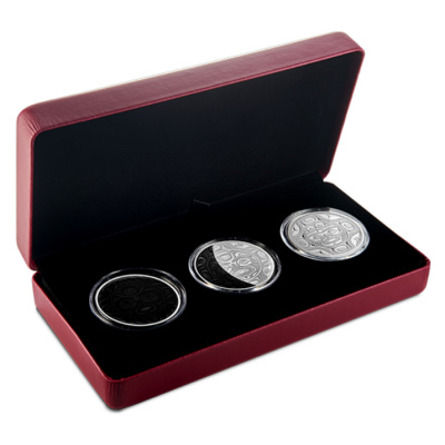 Der Mond erhellt die Dunkelheit und gibt Orientierung. Für viele Generationen war er zudem der Wächter der Nacht. Seine Wanderung über den Nachthimmel spiegelte den zyklischen Rhythmus des Lebens wider. Für die Bevölkerung am Meer nimmt er außerdem Einfluss auf die Gezeiten. Innerhalb des Mondes liegt die Macht der Verwandlung. Dieses wunderbare Silbermünzen Set aus Kanada widmet sich den Phasen des Mondes und präsentiert diese in 3 Feinsilbermünzen zu je 2 Oz mit einem Nennwert von je 30 kanadischen Dollars. Die schwarzen Flächen sind mit Emaille per Handarbeit überzogen. Das Motiv der Münzen ist geprägt von Kunst aus dem pazifischen Nordwesten Kanadas. Die Ausgabe ist auf nur 3.000 Stück weltweit streng limitiert. Die Auslieferung erfolgt im Original-Etui mit Umverpackung und nummeriertem Echtheitszertifikat.