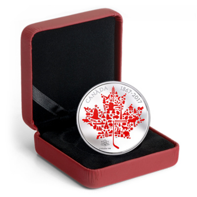Diese Silbermünzenausgabe vereint auf besondere weise eine Vielzahl für typisch kanadische Symbole zu einem großen Ahornblatt, das typischste Wahrzeichen Kanadas. Diese Feinsilbermünze ist auf nur 1.500 Stück weltweit streng limitiert und hat einen Nennwert von 50 Kanadischen Dollars. Die Auslieferung erfolgt im Original-Etui mit Umverpackung und nummeriertem Echtheitszertifikat.