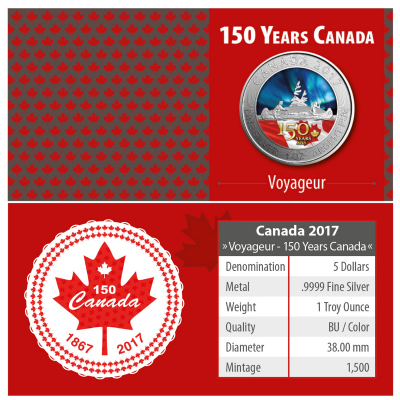 Das Design der Canada 150 Silberunze stammt aus dem Jahr 1935 und wurde anlässlich des silbernen Thronjubiläums Georg V. vom torontoer Bildhauer Emanuel Hahn entworfen. Es zeigt einen europäischen Siedler und einen amerikanischen Ureinwohner die sich in einem Kanu den Grenzen der kanadischen Wildnis nähern - bis heute ein Abenteuer. Schon zur Zeit seiner Entstehung war das Design äußerst beliebt. Wohl auch, weil es eines der ersten war, die in Kanada entworfen wurden und mit eigenen Mitteln geprägt wurden. Zwar produzierte Kanada schon seit 1908 eigene Münzen, die Werkzeuge, Motive und Stempel stammten aber noch von der Royal Mint. Die Feinsilberanlagemünze die in der hohen Reinheit 999,9/1000 produziert wird, kommt in der Qualität Stempelglanz und ist aufwendig coloriert. Die Auslieferung erfolgt gekapselt mit Produktkarte!