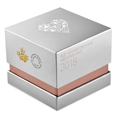 Diese wunderschöne Feinsilbermünze ist ein ideales Hochzeits- oder Hochzeitstaggeschenk. Sie zeigt ein Herz aus mehreren kleinen Herzen und filigranen Mustern und ist zudem aufwendig und hochkarätig in Rosegold vergoldet. Die Münze kommt selbstverständlich in der höchsten Prägequalität Polierte Platte und wird im edlen Geschenk-Original-Etui mit nummeriertem Echtheitszertifikat verausgabt.