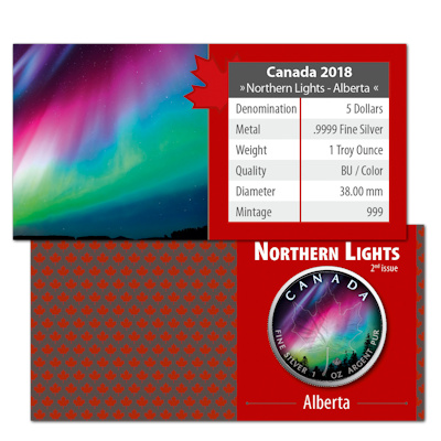 <<< Kanada - 5 CAD Maple Leaf Alberta Nordlichter 2018 - 1 Oz Silber Color | |
