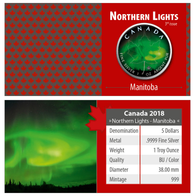 <<< Kanada - 5 CAD Maple Leaf Manitoba Nordlichter 2018 - 1 Oz Silber Color | |