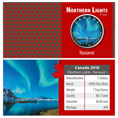 <<< Kanada - 5 CAD Maple Leaf Nunavut Nordlichter 2018 - 1 Oz Silber Color | |