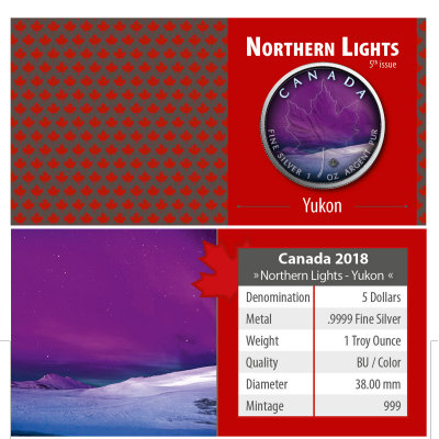 <<< Kanada - 5 CAD Maple Leaf Yukon Nordlichter 2018 - 1 Oz Silber Color | |