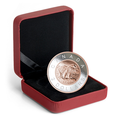Es handelt sich hier um die 6. Ausgabe der mit Rose Gold vergoldeten BigCoin Serie der Royal Canadian Mint und zeigt das Motiv Eisbär auf der 2 Dollar Münze. Die Münze ist beidseitig vergoldet!