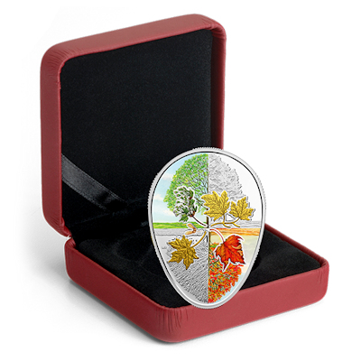 Diese ganz besondere Maple Leaf Ausgabe zeigt das beliebte Ahornblatt im Wechsel der 4 Jahreszeiten. Die 1 Oz schwere Feinsilbermünze ist in höchster Prägequalität Polierte Platte geprägt und zudem aufwendig coloriert. Die Auslieferung erfolgt im Original-Etui mit Umverpackung und nummeriertem Echtheitszertifikat. Die Ausgabe ist auf nur 4.000 Stück weltweit streng limitiert.