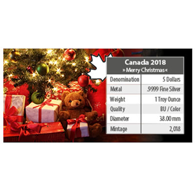 <<< Kanada - 5 CAD Maple Leaf Merry Christmas 2018 - 1 Oz Silber Color | |