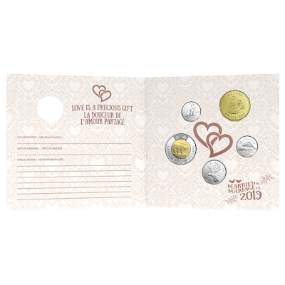 Dieser speziell zur Hochzeit ausgegebene Kursmünzensatz der Royal Canadian Mint beinhaltet eine 2 Dollar, 1 Dollar, 25 Cent, 10 Cent und 5 Cent Kursmünze im wunderschön gestalteten Blister verpackt. Die 1 Dollar Ausgabe wurde speziell für diesen Satz geprägt und ist nur in diesem Satz erhältlich.