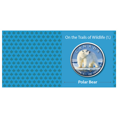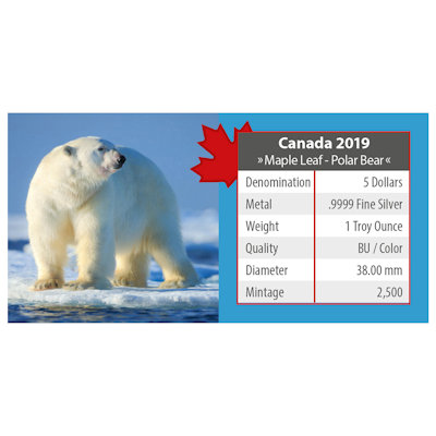 <<< Kanada - 5 CAD Maple Wildtiere Unterwegs Eisbär 2019 - 1 Oz Silber Color | |