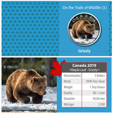 <<< Kanada - 5 CAD Maple Wildtiere Unterwegs Grizzly 2019 - 1 Oz Silber Color | |