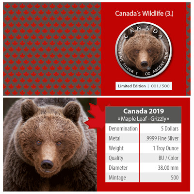 <<< Kanada - 5 CAD Maple Leaf Wildlife Grizzlybär 2019 - 1 Oz Silber Color | |