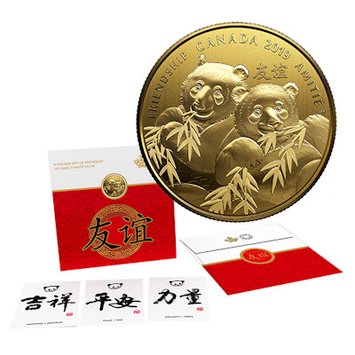 Dieser friedvolle Panda soll ein Geschenk der Freundschaft sein und steht unter dem Motto ein goldenes Geschenk der Freundschaft. Die Münze besteht aus 9999er Feinsilber in der Prägequalität Modified Specimen, ist 24-Karat vergoldet und trägt einen Nennwert von 8 Kanadischen Dollars. Die Zahl 8 bedeutet in China Glück. Die Auslieferung erfolgt im Original-Etui mit Umverpackung und nummeriertem Echtheitszertifikat.