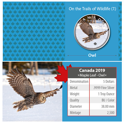<<< Kanada - 5 CAD Maple Wildtiere Unterwegs Eule 2019 - 1 Oz Silber Color | |