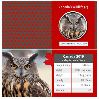 <<< Kanada - 5 CAD Maple Leaf Wildlife Eule 2019 - 1 Oz Silber Color | |