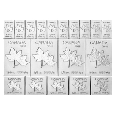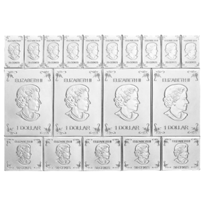 Diese Neuheit der Royal Canadian Mint ist ein teilbarren Silbermünzbarren und beinhaltet 4 Stücke zu 1/4 Oz Feinsilber, 5 Stücke zu 1/10 Oz Feinsilber und 10 Stücke zu 1/20 Oz Feinsilber und somit genau 2 Oz Feinsilber als verbundenen Silberbarren der in einer Kunststoffkapsel ausgeliefert wird. Die Teilstücke sind verlustfrei zu brechen und so kann dieser Tafelbarren in kleinere Einheiten problemlos aufgeteilt werden.
