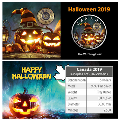 <<< Kanada - 5 CAD Maple Halloween The Witching Hour 2019 - 1 Oz Silber Color | |