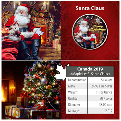 <<< Kanada - 5 CAD Maple Leaf Weihnachtsmann 2019 - 1 Oz Silber Color | |