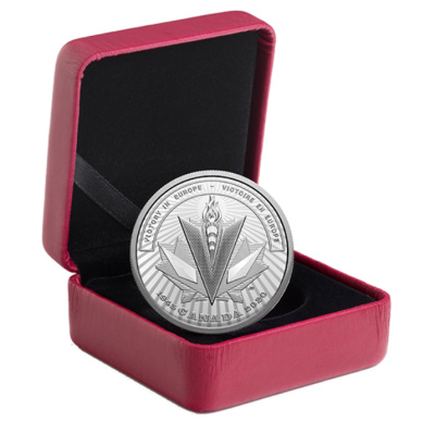 Zitat: Wir gewinnen, wenn wir bereitwillig arbeiten. Der Sieg erfordert Opfer verschiedenster Art, und genau das repräsentiert dieses aufwendig gravierte Design. Das kühne V und die brennende Fackel aus dem Victory Nickel von 1943-45 sind Echos unserer Vergangenheit und drücken den Wunsch aus, niemals zu vergessen. Abgerundet wird die ahornblattförmige Anordnung durch die geometrischen Formen, die die unterschiedlichen Hintergründe (kulturell, ethnisch, sprachlich) der Männer und Frauen, die gedient haben, sowie ihre Beiträge zum Sieg vor 75 Jahren darstellen.