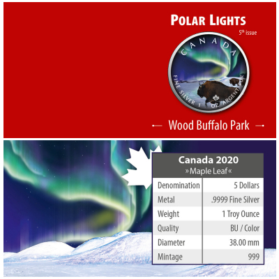 <<< Kanada - 5 CAD Maple Leaf Polarlichter 5: Wood Buffalo Park - 1 Oz Silber Color | |