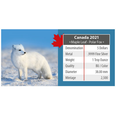 <<< Kanada - 5 CAD Maple Wildtiere Unterwegs Polarfuchs 2021 - 1 Oz Silber Color | |