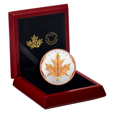 Sie haben Kanadas National-Symbol noch nie so gesehen. Die Ausgabe 2021 der Maple Leaves in Motion-Serie ist die erste Münze mit doppelter Beschichtung (Gelb- und Roségold) auf einem großen, facettenreichen Design. Das Ergebnis ist atemberaubend. Aus jedem Blickwinkel betrachtet heben und senken sich die gravierten Facetten sanft, um dem Ahornblatt eine mehr dimensionale Form zu verleihen, die mit dem Licht spielt. Diese gravierten Formen sind auch mit Gelb- oder Roségold überzogen, um einen leuchtenden Farbkontrast zu erzeugen, der wirklich auffällt - genau wie Kanadas Ahornbäume im Herbst. Die Münze besteht aus 5 Oz Feinsilber in der höchsten Prägequalität Polierte Platte und ist auf nur 1.500 Stück streng limitiert. Die Auslieferung erfolgt im Original-Etui mit Umverpackung und nummeriertem Echtheitszertifikat.