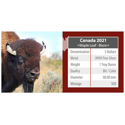 <<< Kanada - 5 CAD Maple Leaf Wildlife Bison 2021 - 1 Oz Silber Color | |