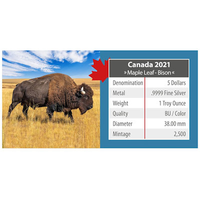 <<< Kanada - 5 CAD Maple Wildtiere Unterwegs Bison 2021 - 1 Oz Silber Color | |